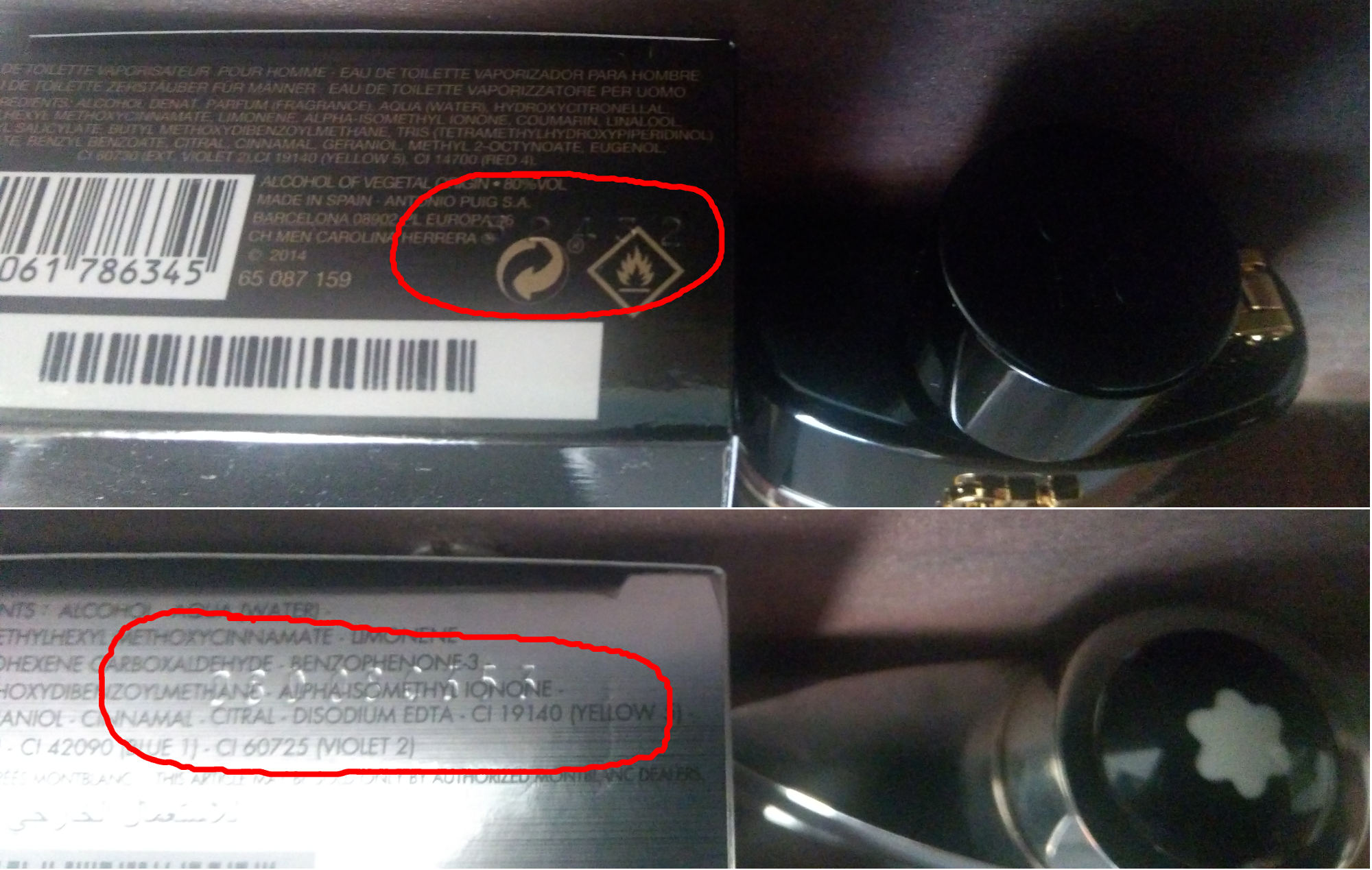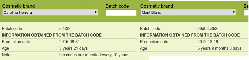 Sono andato a guadare i batch codes indicati sulla scatola, ossia 08d08c353 per il Montblanc, e 52432 per il Carolina Herrera… dalle foto non si leggono benissimo, ma dovreste comunque riuscire a vederli con i vostri occhi.batch codes profumi notinoSono poi andato a controllare questi codici su CheckFresh.com per avere un primo riscontro (seppur non conclusivo) sull’autenticità, e per verificare la rispettiva data di produzione.